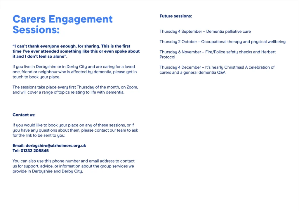 If you would like to attend one of the Dementia Cafes or have an interest in joining Singing for the Brain, then please contact one of the group facilitators in the Derbyshire Dementia Support team on 01332 208845 or you can email us at derbyshire@alzheimers.org.uk.