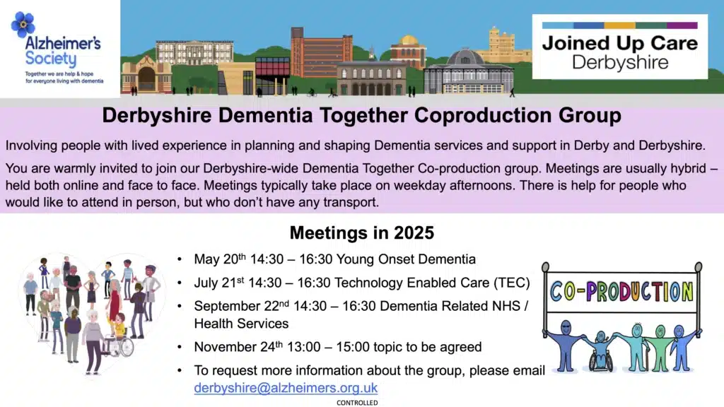 Who can attend these groups: Derbyshire residents with or awaiting a diagnosis of dementia, plus their carer/family member.