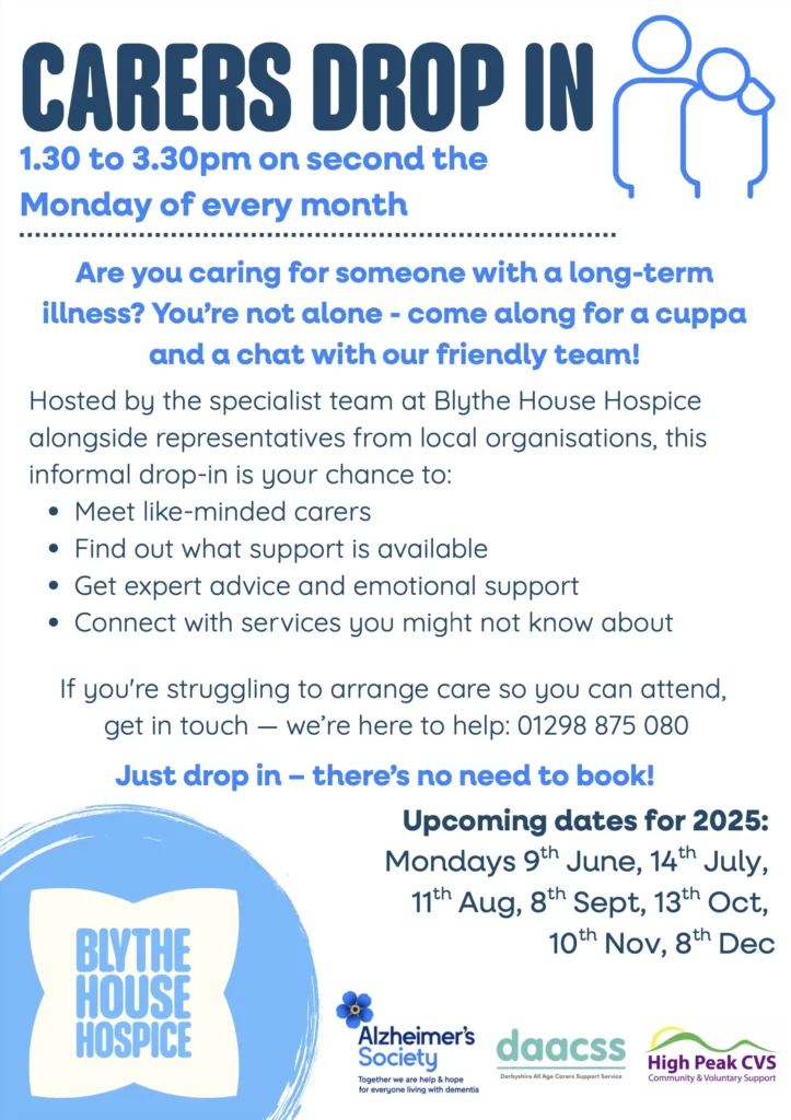 Blythe House Hospice in Chapel-en-le-Frith has started a new carer drop-in group. Dementia Adviser, Barbara White attended the first of these meetings and is planning on being at subsequent events. You will be able to chat with Barbara and staff from other organisations, and information will be available on the day.